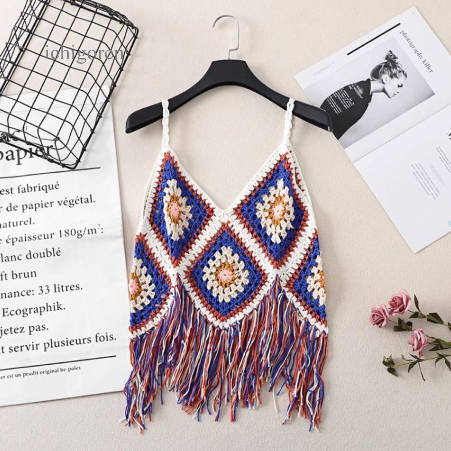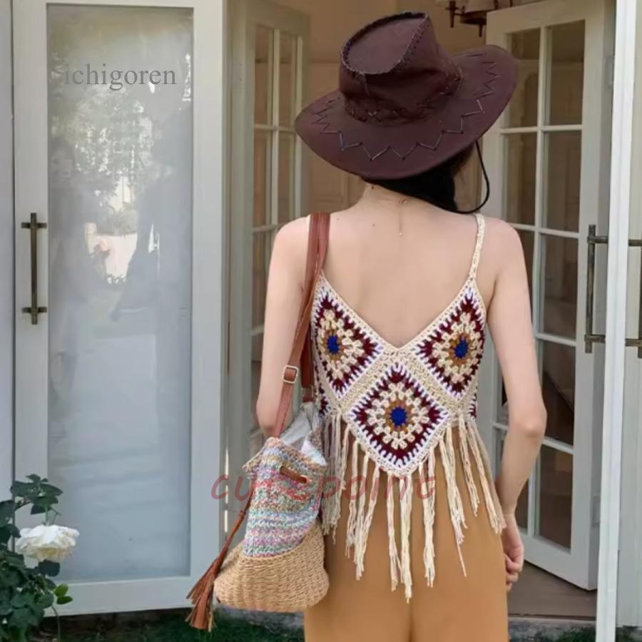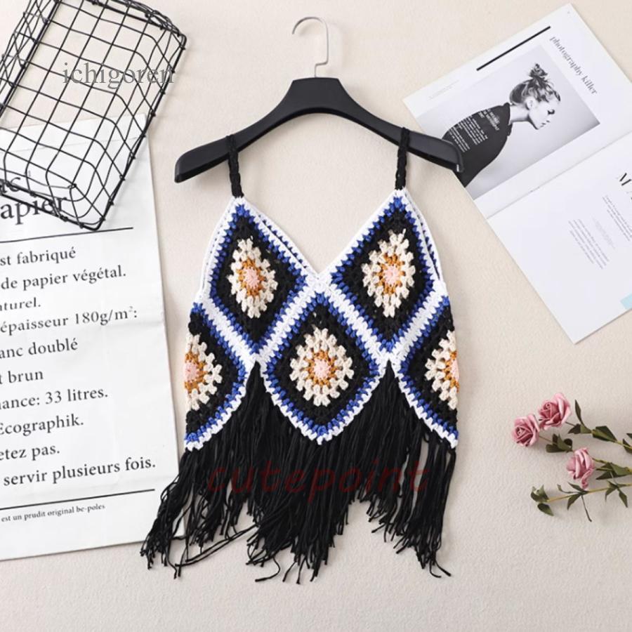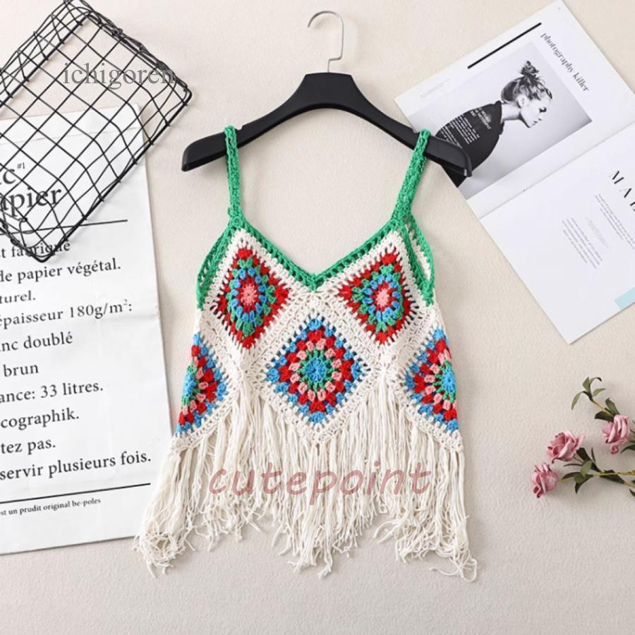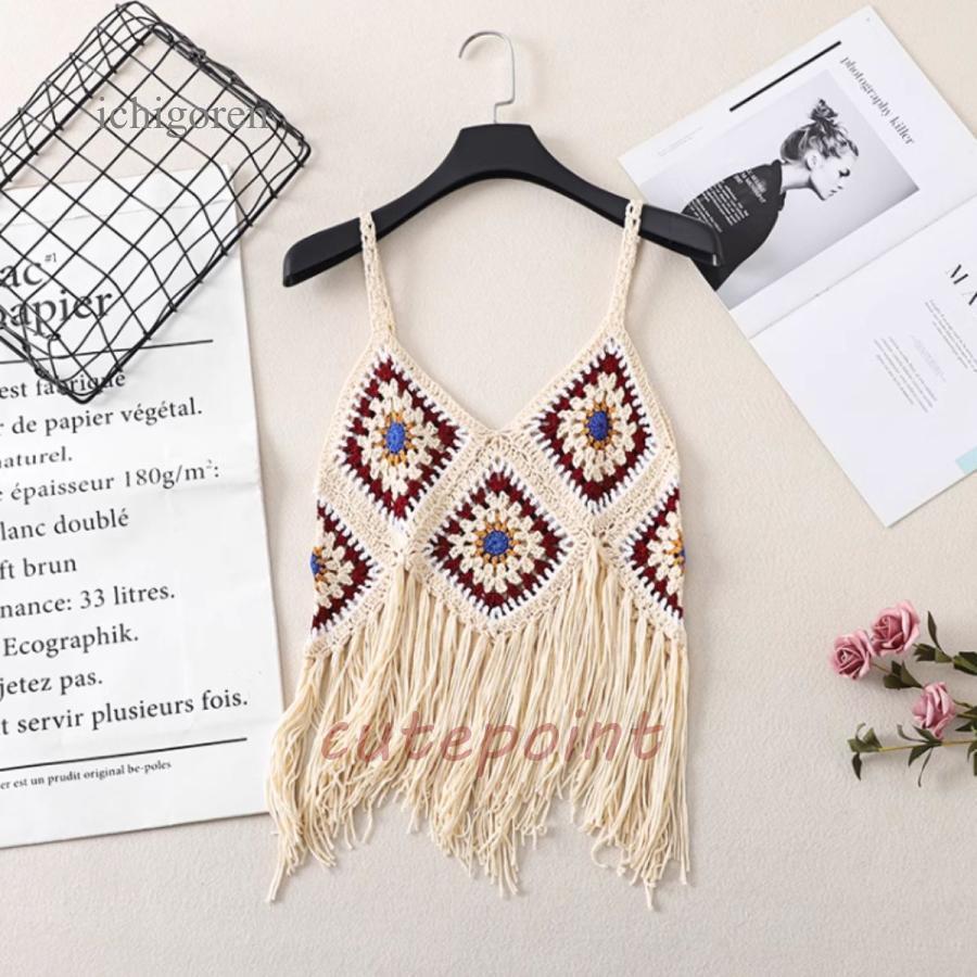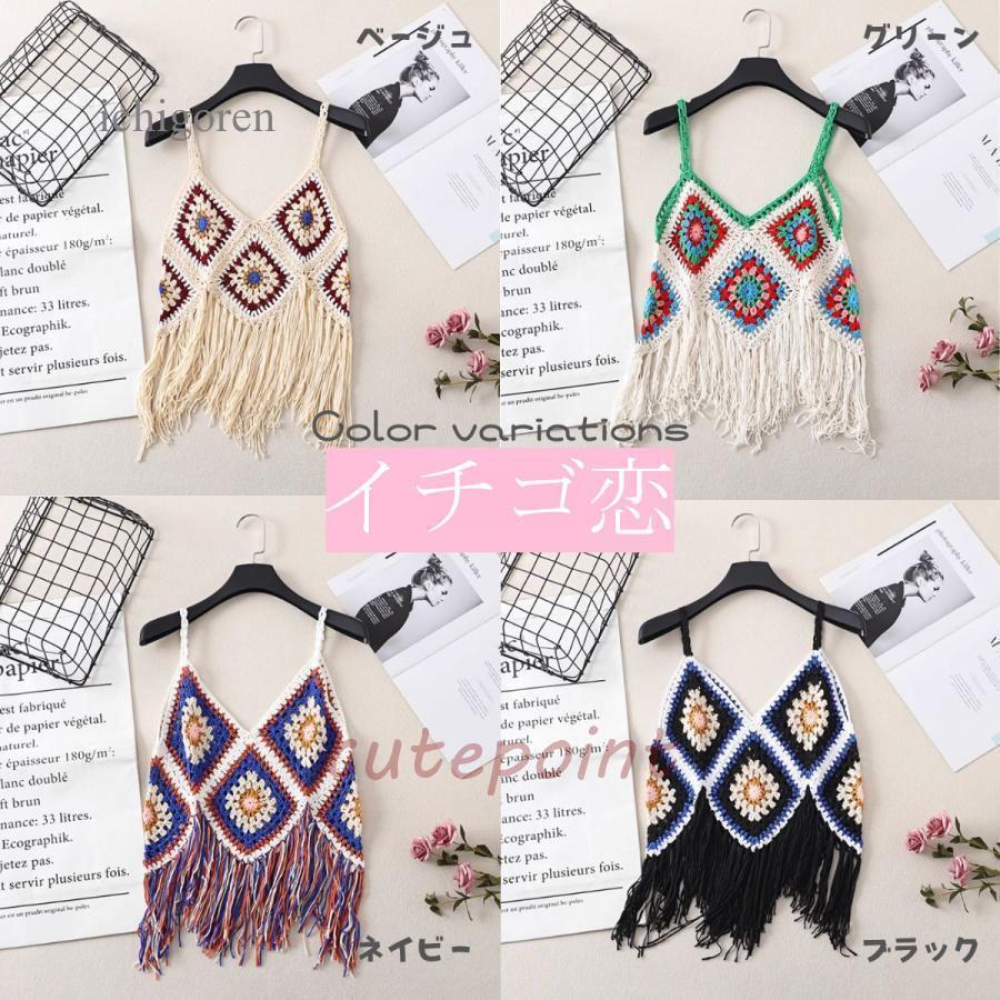 ビスチェ キャミソール ニット かぎ編み ボヘミアン レディース 韓国ファッション フリンジ レトロ 肌見せ 重ね着 カラフル 大人 春夏