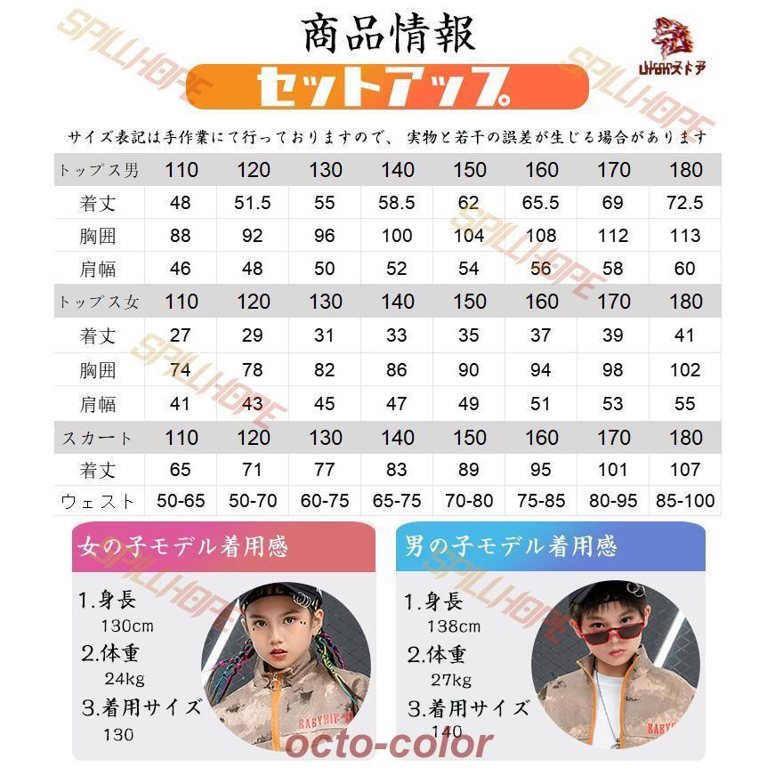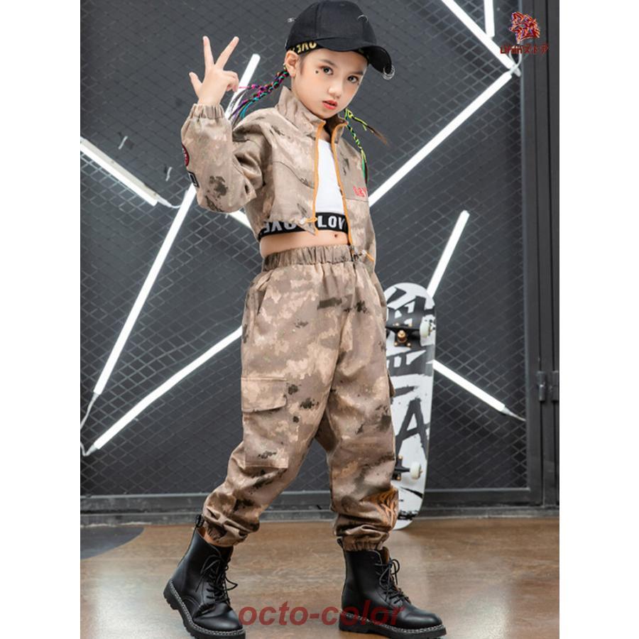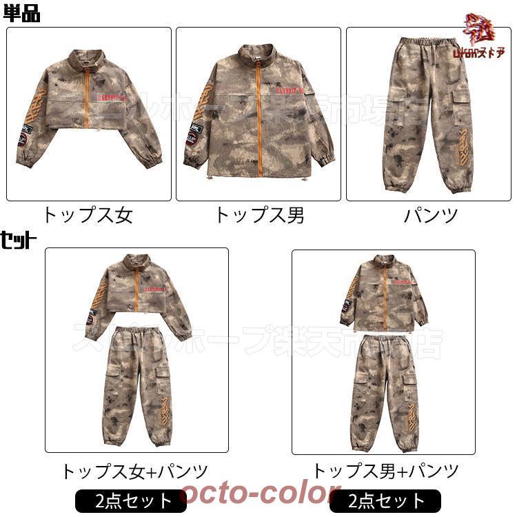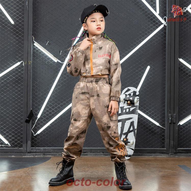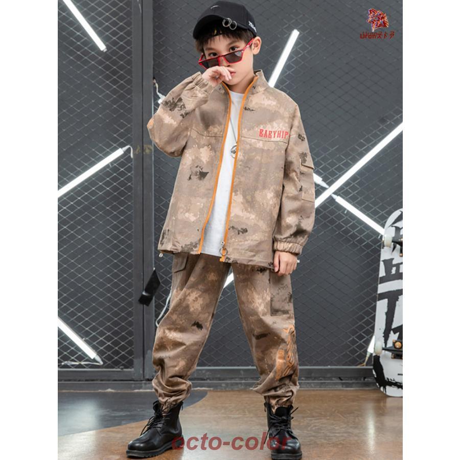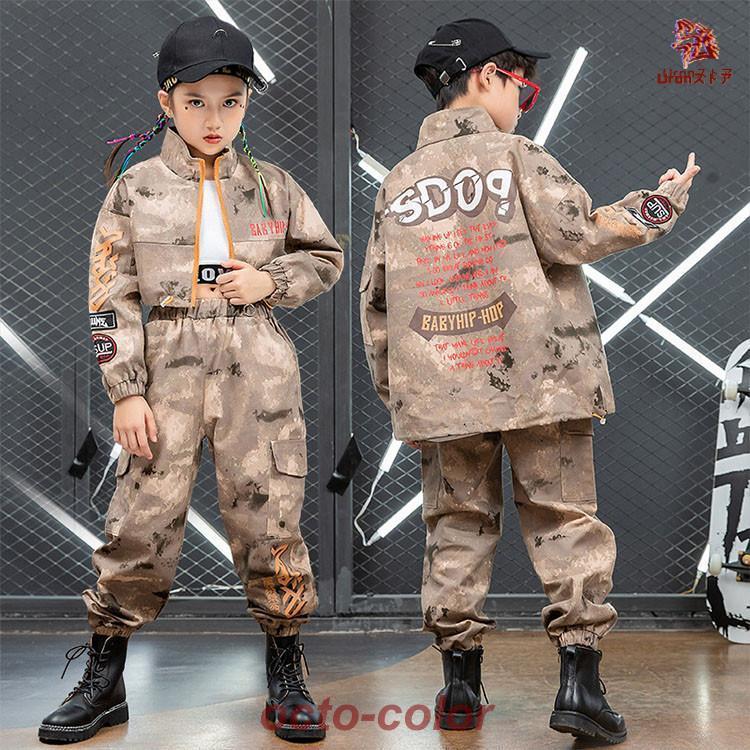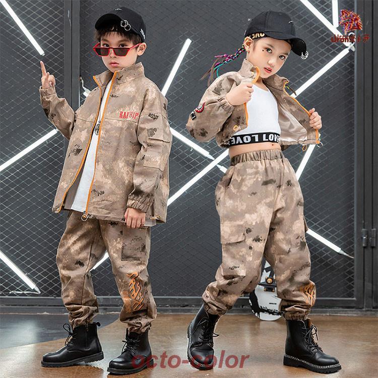 迷彩 ブラウン トップス ジャケット カーゴパンツ キッズ ダンス衣装 セットアップ 上下セット おしゃれ 女の子 男の子 子供 かっこいい かわいい 長袖 総柄 ダ
