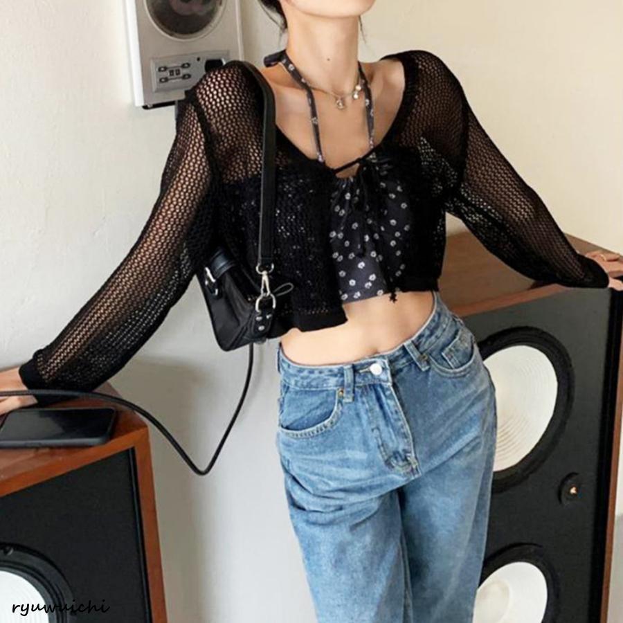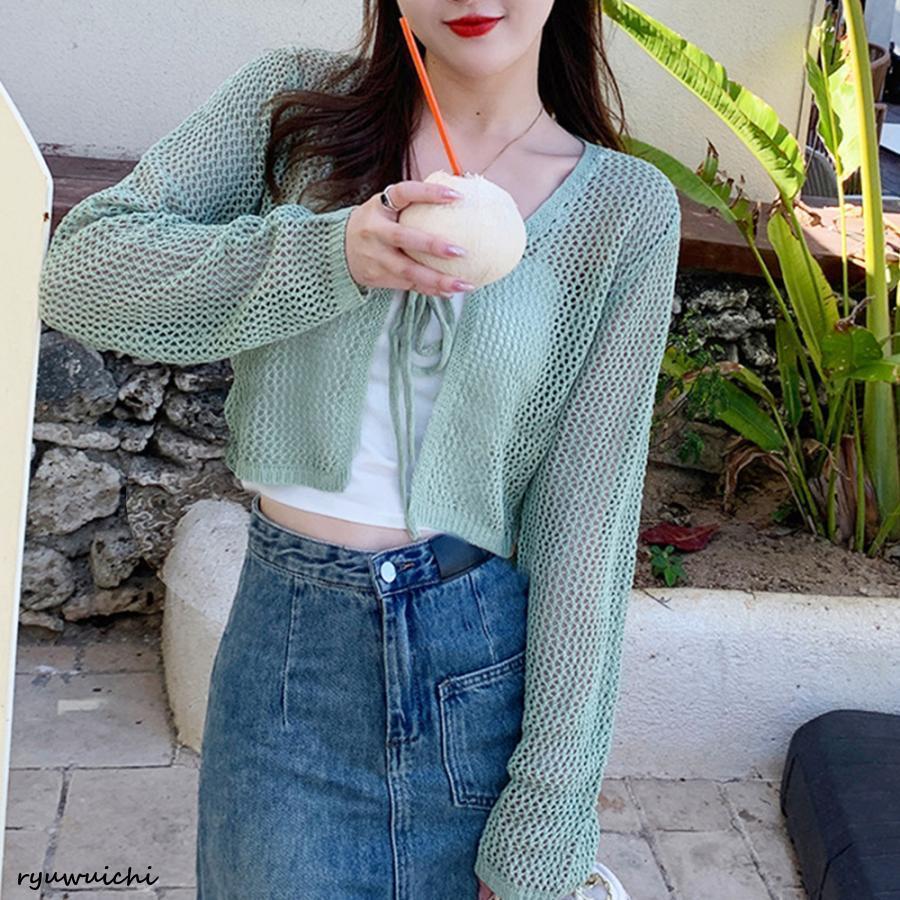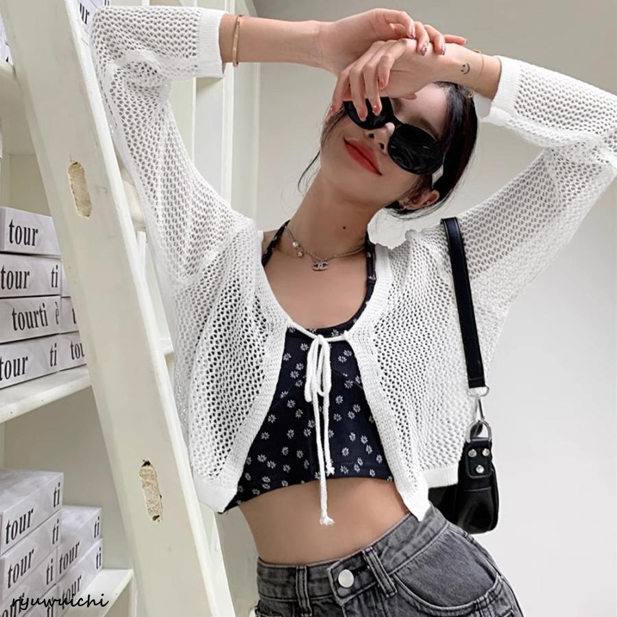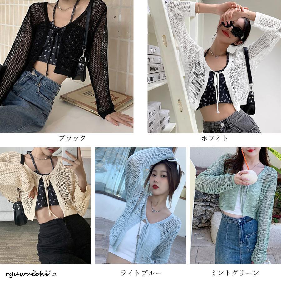 クロップド丈 ニットカーディガン 薄手 透かし編み サマーニット 夏トップス 前開き へそ出し お洒落 韓国風 リボン