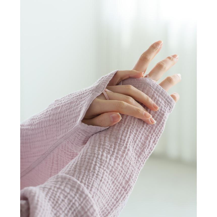 肌に優しい綿100%のダブルガーゼを使ったボレロのカーディガン。袖口にゴムが付いているので、ちょうど良い長さでキープできます。