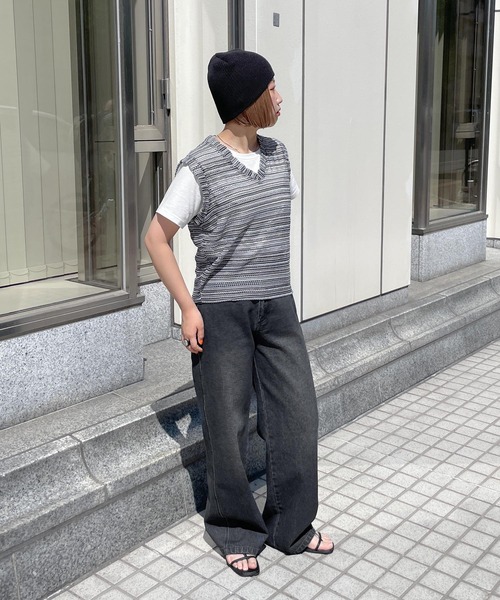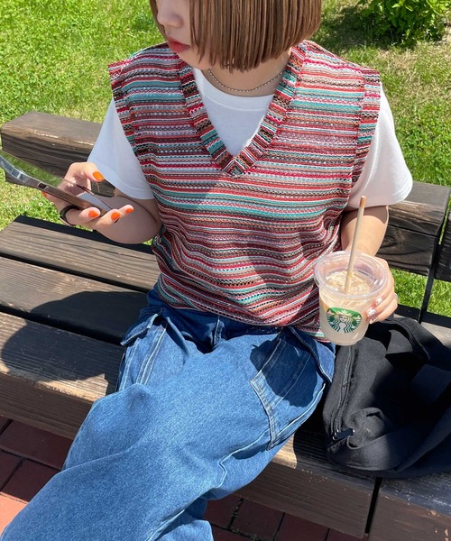 キーワード:ベスト ジレ レディース ノースリーブ ボーダー ナチュラル 大人カジュアル