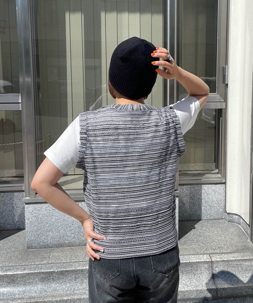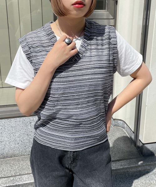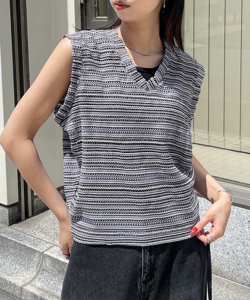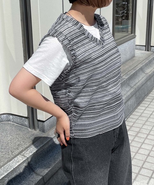 ベスト ジレ メッシュボーダーサマーニットベスト レディース