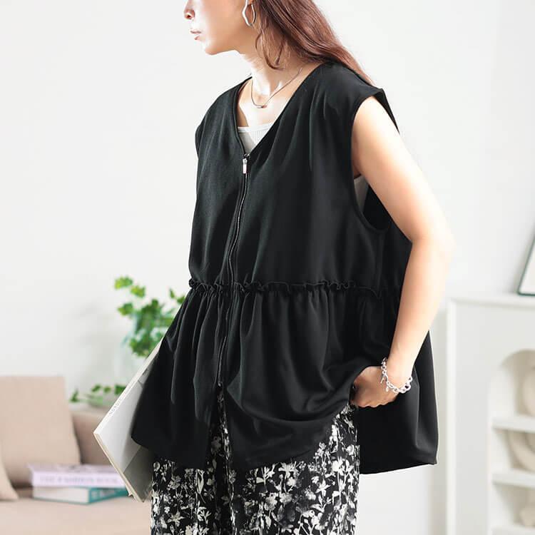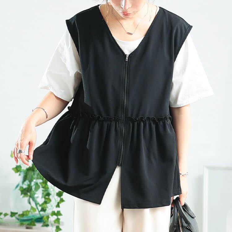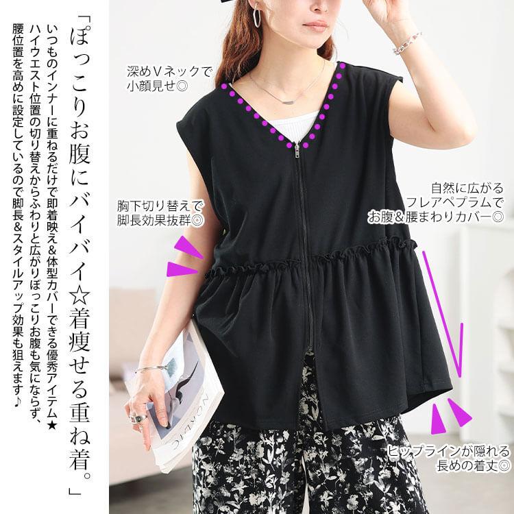 GOLDJAPAN 大きいサイズ レディース アウター ジャケット トップス ベスト ジレ ペプラム フリル ジップ ノースリーブ 夏コーデ 夏 秋 冬 春 LL 2L 3L 4L 5L ブラック 黒