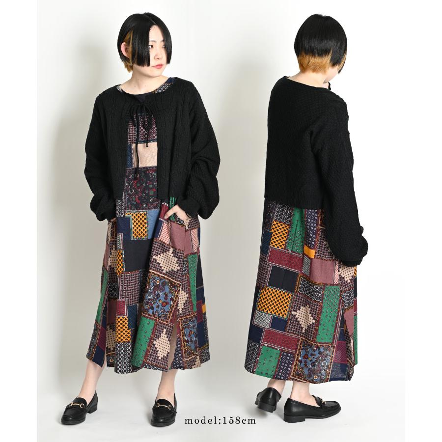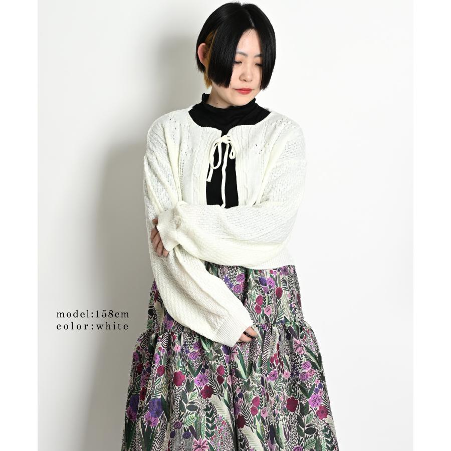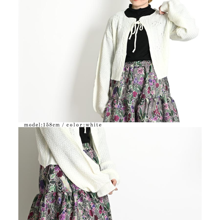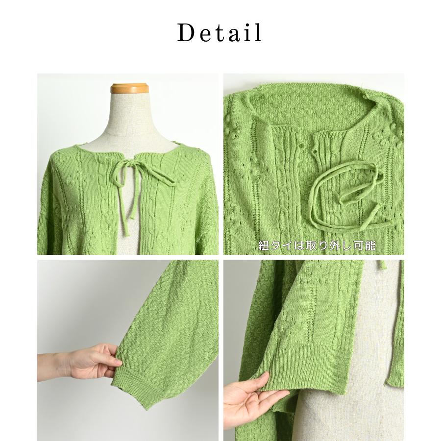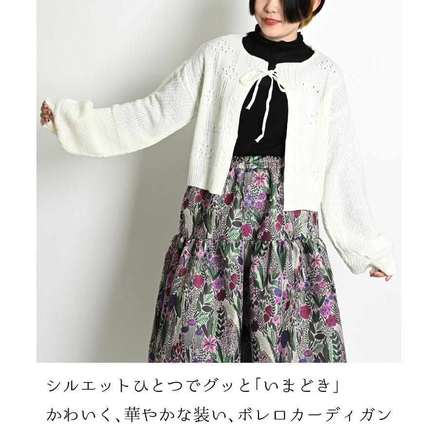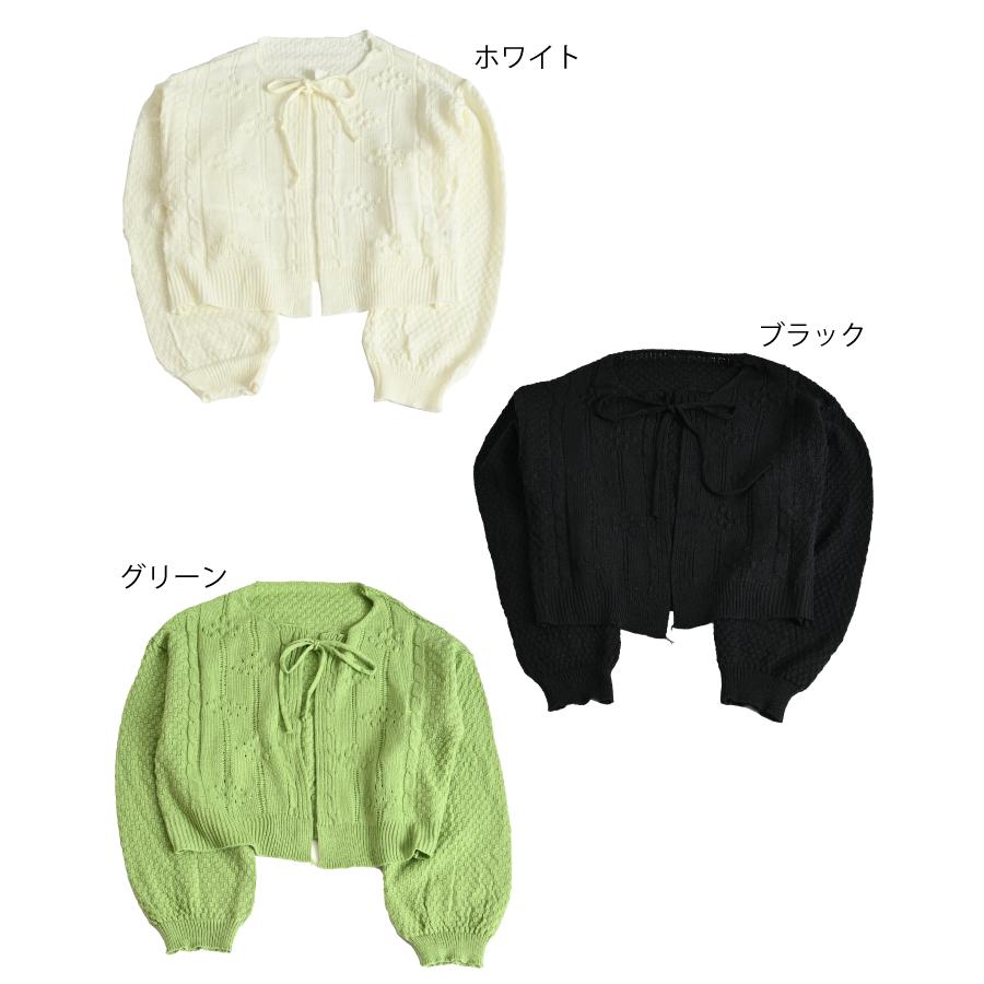 marai カーディガン レディース 春 ショート丈 紐 ボリューム 袖 ぽわん袖 ボリュームスリーブ 長袖 リボン 無地 白 黒 ニット セーター ボレロ
