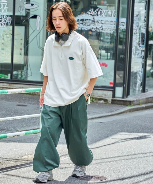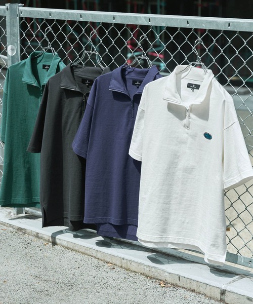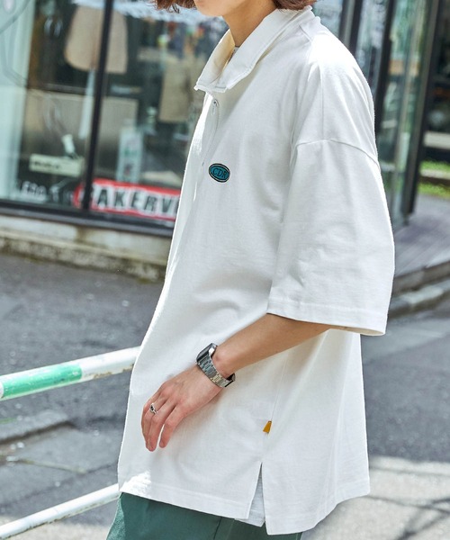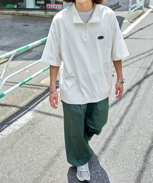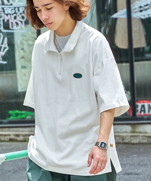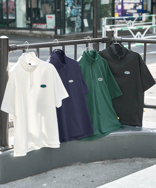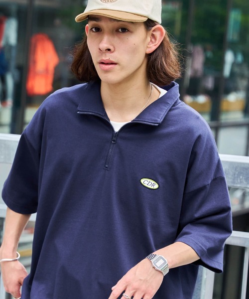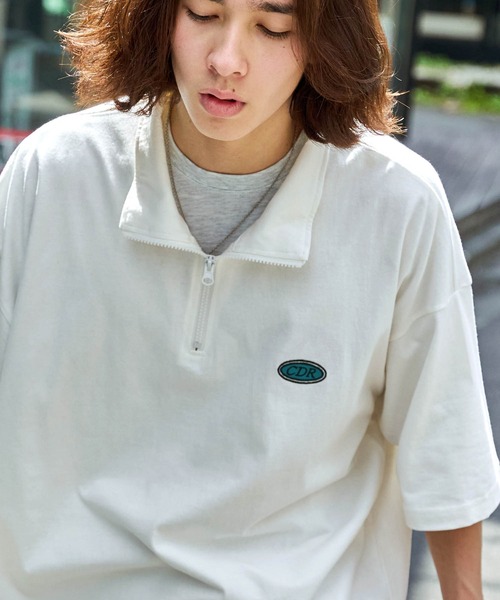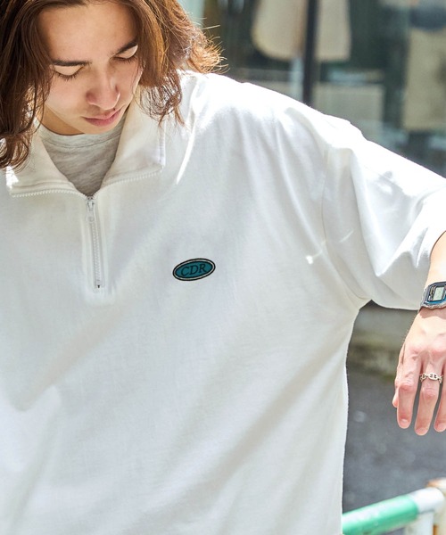 参考商品名:【CODDERR】ハーフジップ ワッペンロゴ刺繍 ビッグシルエット半袖Tシャツ