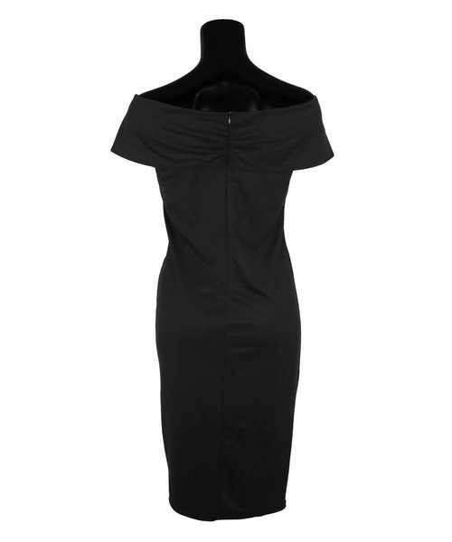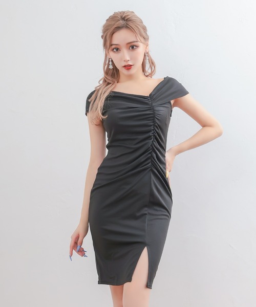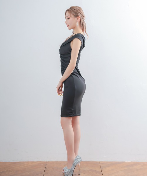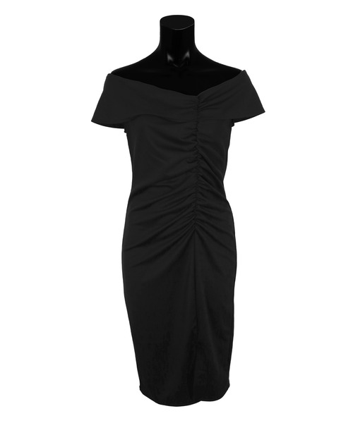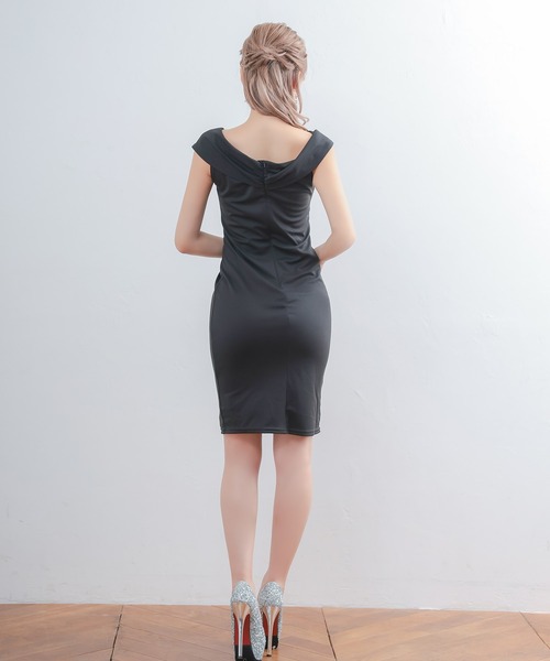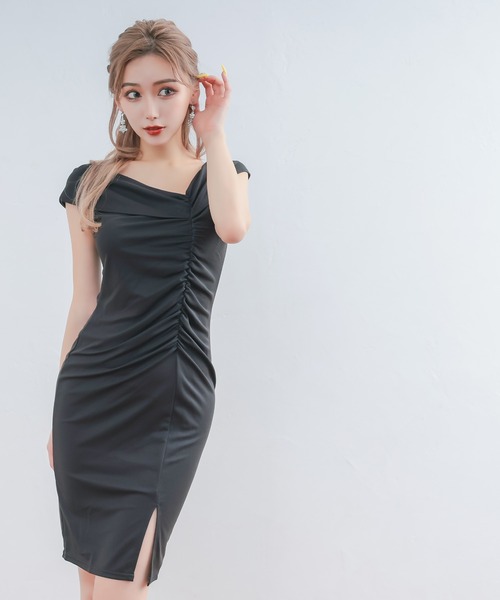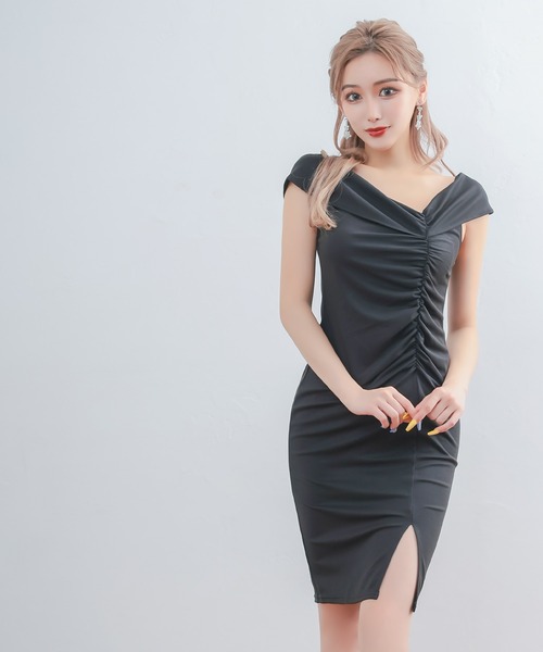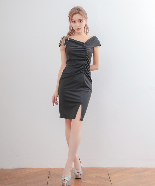 商品名:キャバドレス オフショルダーシャーリングスリットワンカラータイト膝丈ドレス (Mサイズ)